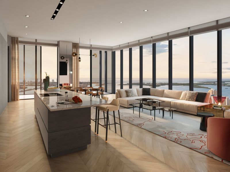 10-foot floor-to-ceiling windows with stunning views of city and downtown skyline, Miami Beach and Atlantic Ocean