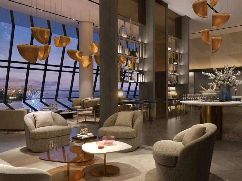 Owners Lounge with double height ceilings, billiard and entertainment room with panoramic bay views, designed for