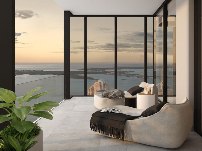 10-foot floor-to-ceiling windows with stunning views of city and downtown skyline, Miami Beach and Atlantic Ocean