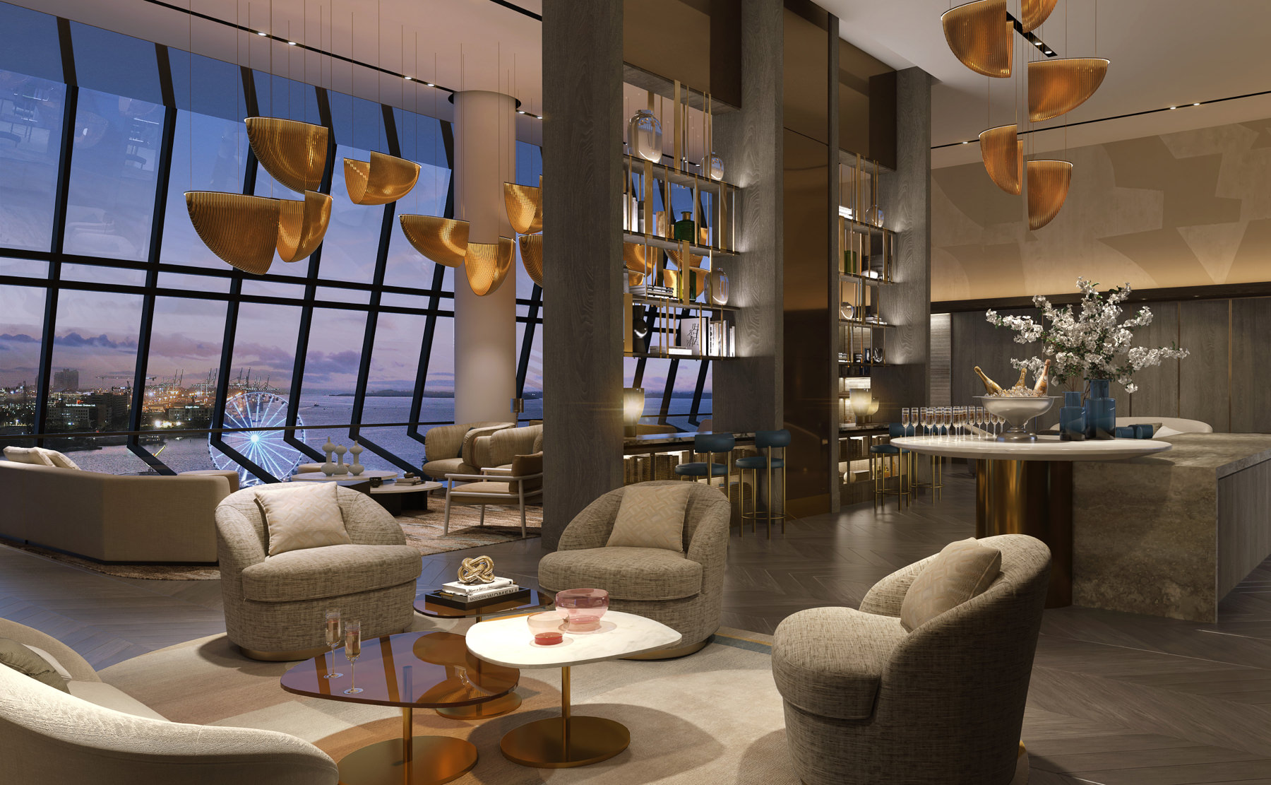Owners Lounge with double height ceilings, billiard and entertainment room with panoramic bay views, designed for