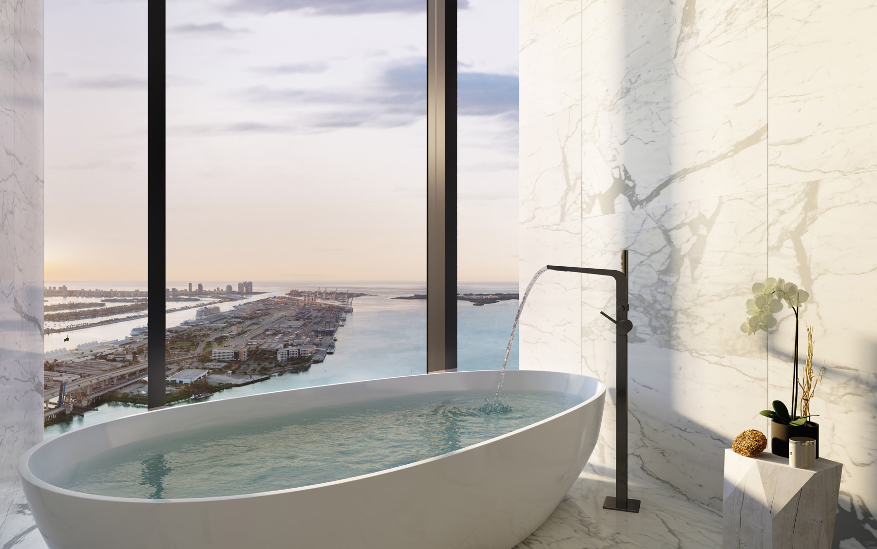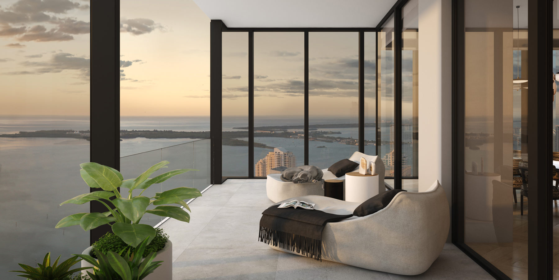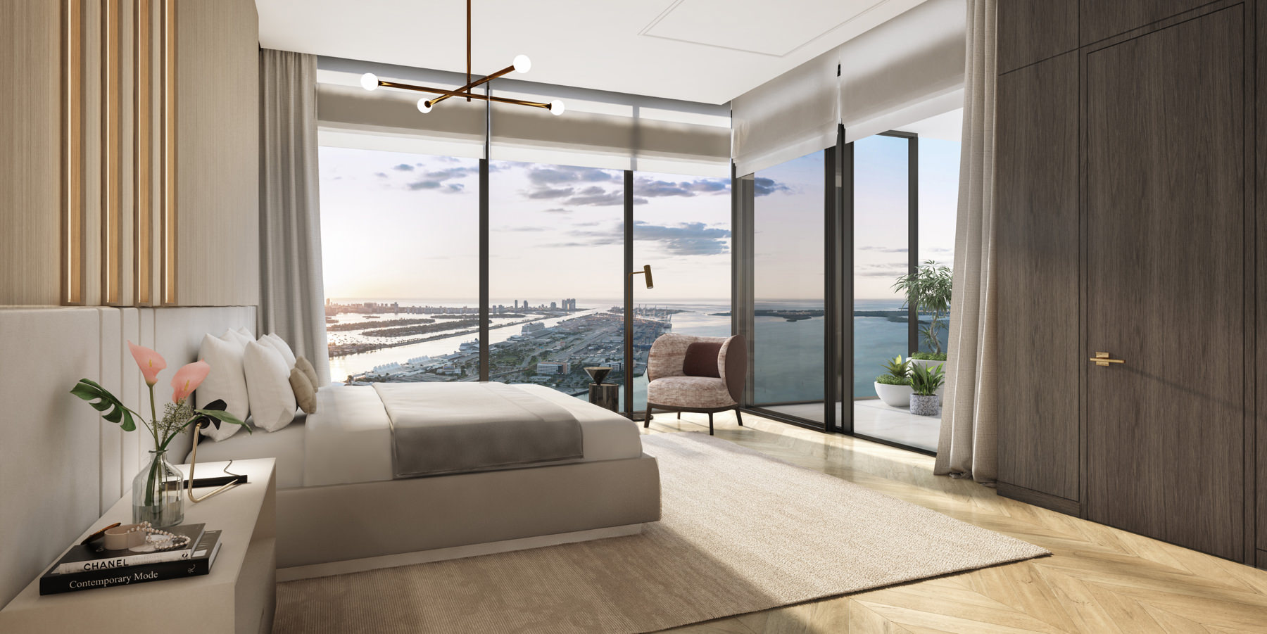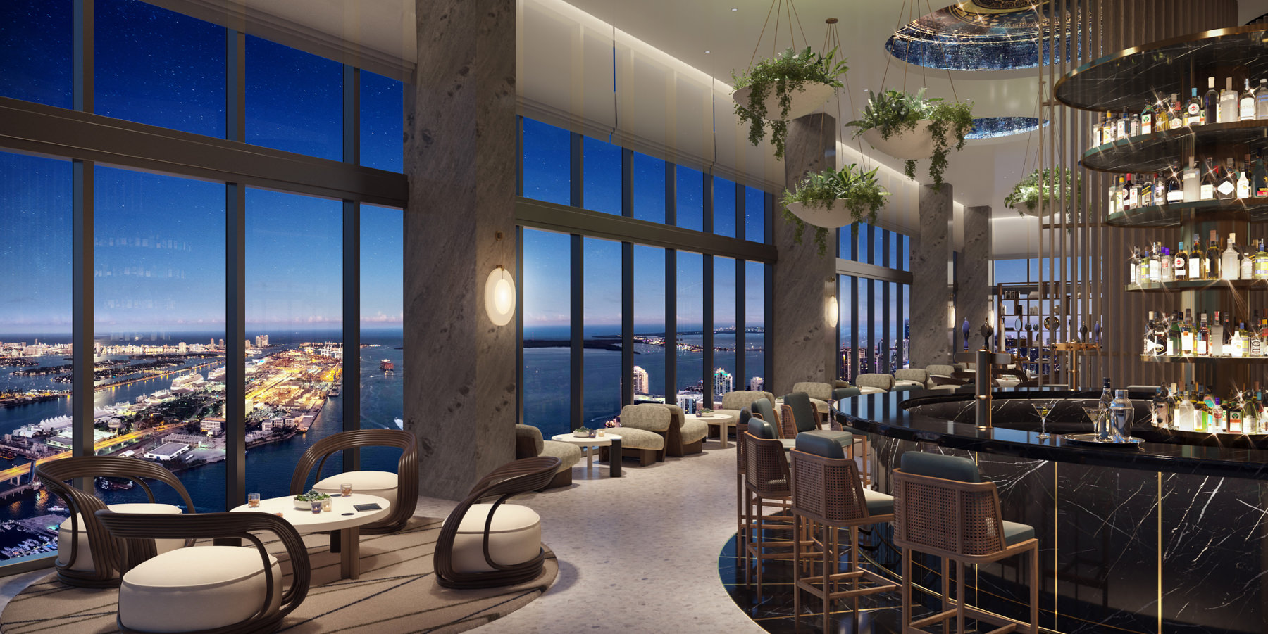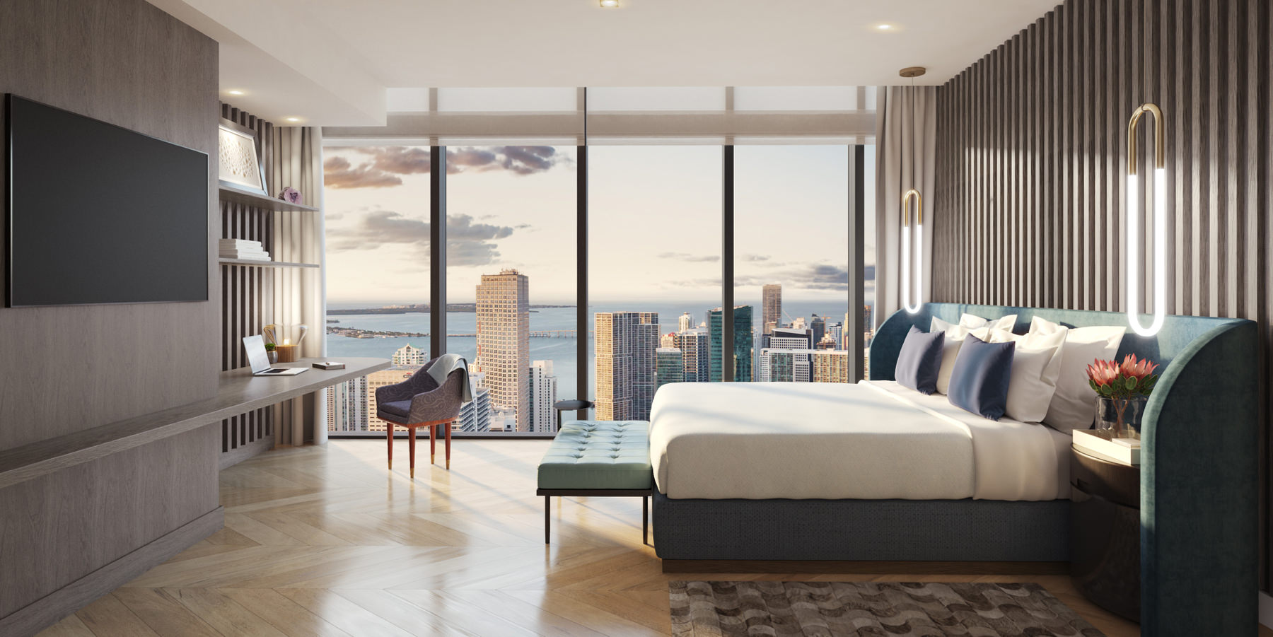 10-foot floor-to-ceiling windows with stunning views of city and downtown skyline, Miami Beach and Atlantic Ocean