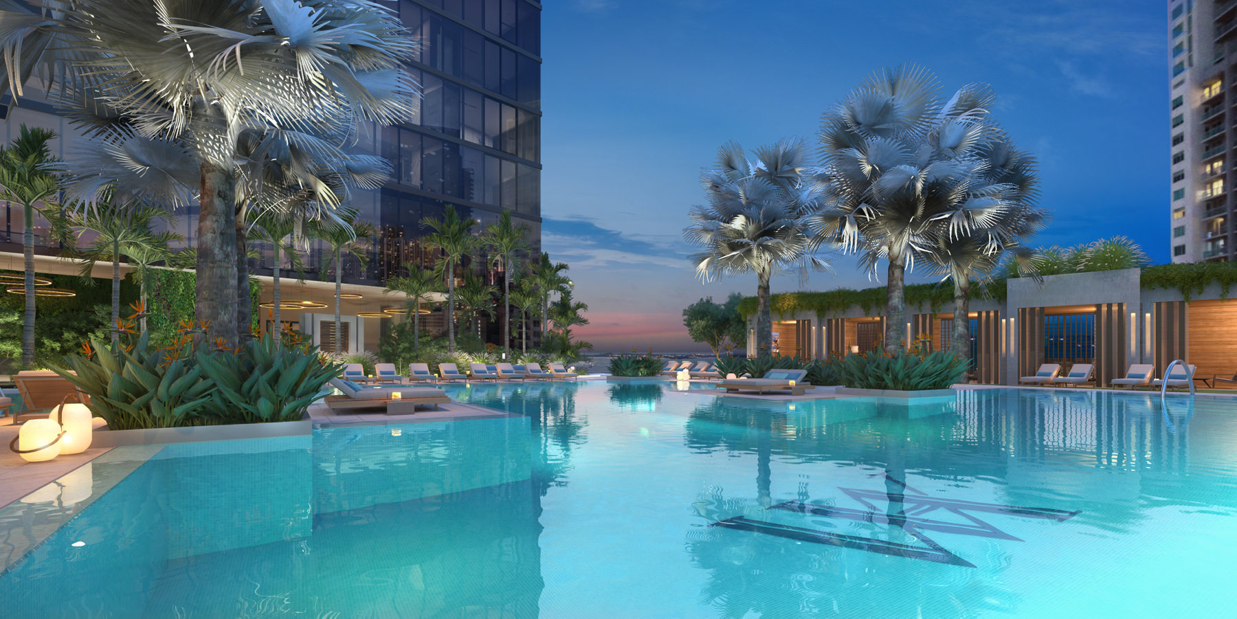 Private residential pool deck with whirlpools and lounging areas